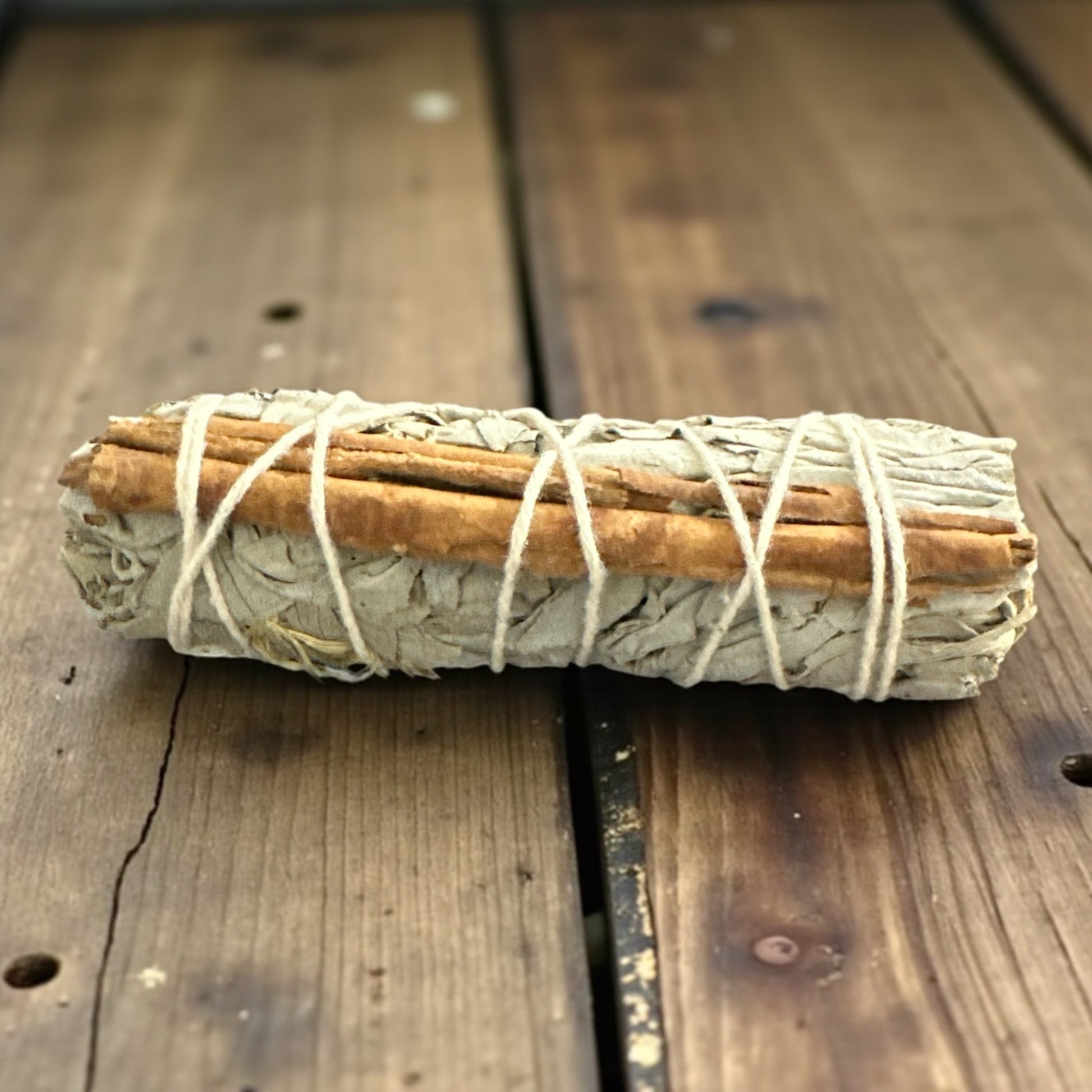 This is no ordinary smudge stick — it’s a double hit of magic. White Sage is the ultimate energy purifier, sweeping away negativity and clearing the path for new blessings. Cinnamon, fiery and sweet, has been used for centuries to draw in prosperity, ignite passion, and raise spiritual vibrations.